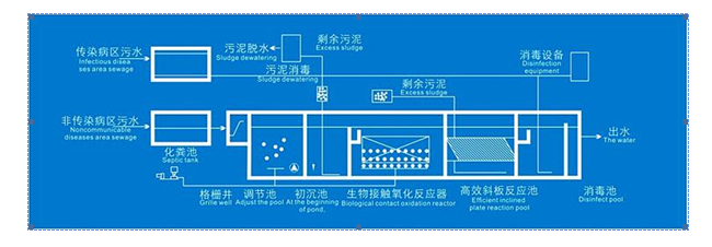 醫(yī)院污水中有機(jī)類雜質(zhì)較多, CODcr 、BOD5均較高,且BOD5/CODcr之值大于0.4,生化性能較好。因此宜采用以生化為主加消毒的工藝處理流程。因污水水量較小,生化設(shè)備采用地埋式一體化醫(yī)療污水處理設(shè)備。