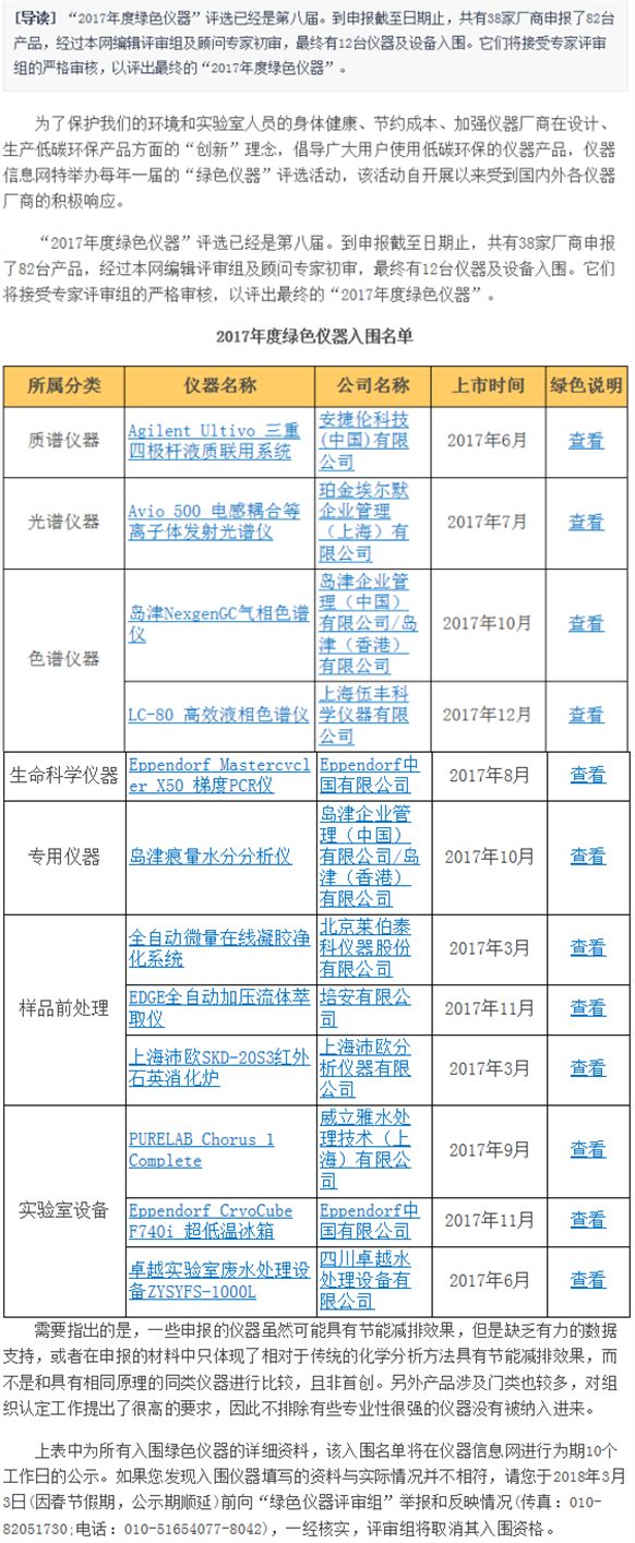 “2017年度綠色儀器”評(píng)選已經(jīng)是第八屆。到申報(bào)截至日期止,共有38家廠商申報(bào)了82臺(tái)產(chǎn)品,經(jīng)過(guò)本網(wǎng)編輯評(píng)審組及顧問(wèn)專(zhuān)家初審,最終有12臺(tái)儀器及設(shè)備入圍。它們將接受專(zhuān)家評(píng)審組的嚴(yán)格審核,以評(píng)出最終的“2017年度綠色儀器”。