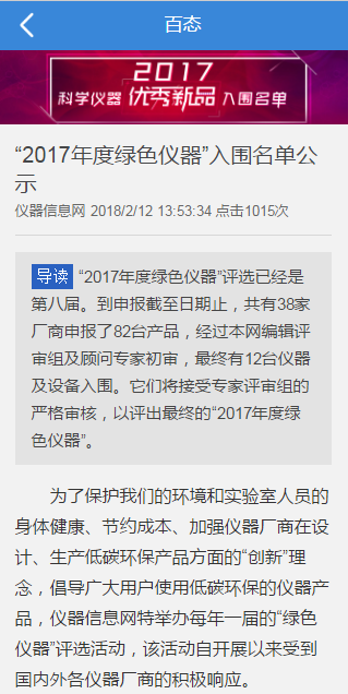 四川卓越水處理 實(shí)驗(yàn)室廢水處理設(shè)備 成功入圍“2017年度綠色儀器”優(yōu)秀新品為了保護(hù)我們的環(huán)境和實(shí)驗(yàn)室人員的身體健康、節(jié)約成本、加強(qiáng)儀器廠商在設(shè)計(jì)、生產(chǎn)低碳環(huán)保產(chǎn)品方面的“創(chuàng)新”理念,倡導(dǎo)廣大用戶使用低碳環(huán)保的儀器產(chǎn)品,儀器信息網(wǎng)特舉辦每年一屆的“綠色儀器”評(píng)選活動(dòng),我們公司的產(chǎn)品“實(shí)驗(yàn)室廢水處理設(shè)備”也在這次活動(dòng)中積極的參加“綠色儀器”優(yōu)秀新品活動(dòng),38家廠商共82臺(tái)產(chǎn)品,接受專(zhuān)家評(píng)審組的嚴(yán)格審核,最終有12臺(tái)儀器及設(shè)備入圍。并且我們四川卓越水處理的產(chǎn)品“實(shí)驗(yàn)室廢水處理設(shè)備”成功的入圍“201...