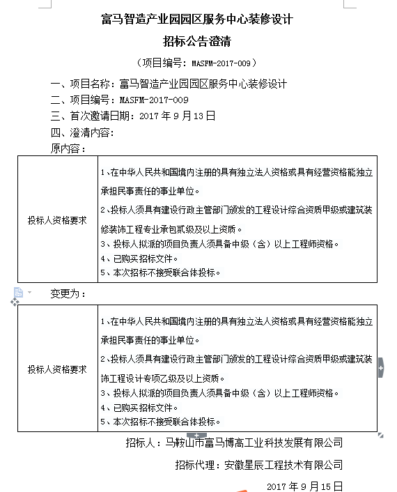 富馬智造產(chǎn)業(yè)園園區(qū)服務(wù)中心裝修設(shè)計招標(biāo)公告澄清