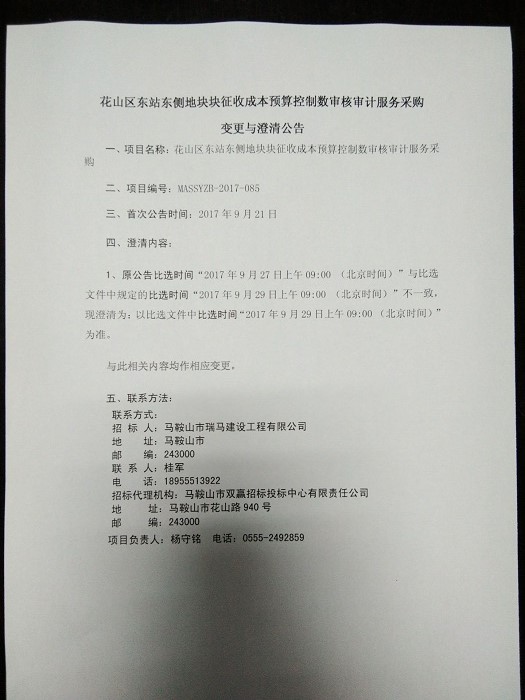 花山區(qū)東站東側(cè)地塊塊征收成本預(yù)算控制數(shù)審核審計(jì)服務(wù)采購變更與澄清公告
