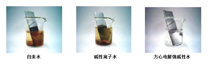 將SPCC板分別浸泡在裝有自來(lái)水、堿性離子水、和PH值為11.7的強(qiáng)電解堿性水的燒瓶中,室溫下放置8天觀察,浸泡在自來(lái)水中的SPCC板只過(guò)了2個(gè)小時(shí)即已開始生銹,而浸泡在碳酸鉀堿性電解水中的SPCC板經(jīng)過(guò)了8天也未生銹。