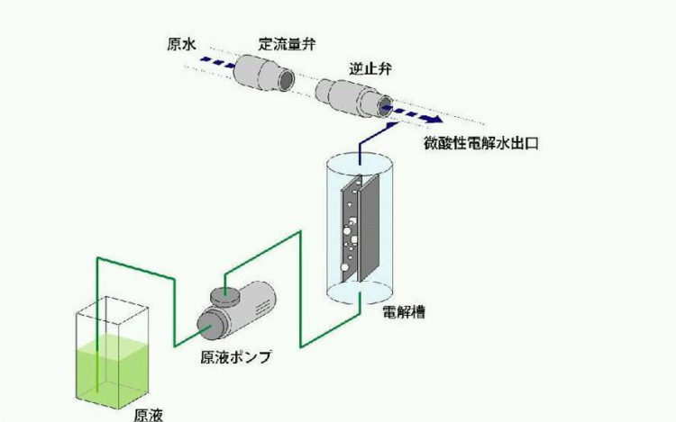強酸性電解水采用卓越ZY-LAEB系列電解槽、通過低電壓電解方式制成的。在陽極中2HCl一H+ +Cl-,生成的Cl+又與HO-反應生成了次氯酸(HOCI)和鹽酸(HCl)。在原水的緩沖下,pH變?yōu)?.0 - 6.5,有效氯濃度為10-30ppm(只有強酸水的1/4以下),氯離子(Cl-)濃度低是這種強酸性電解水的顯著特征。在強酸性電解水的生成過程中,除了生成有殺菌效果的氯外,不再產(chǎn)生氧或臭氧,不會生成氯的高次氧化物如HClO2、HClO3、HClO4等,溶存氧、臭氧、氯氧化物等副生成物的濃度較低,綠色環(huán)保;生成的強酸性電解水為無色透明非粘性液體,含有次氯酸,無味或是略呈氯臭,其pH值接近7,決定它對人體的危害更小,對物體幾乎沒有腐蝕性。強酸性電解水作用后發(fā)生氧化還原反應生成水,原料中不含鹽,使用后即使干燥也不會因為鹽的濃縮和結晶帶來弊害。