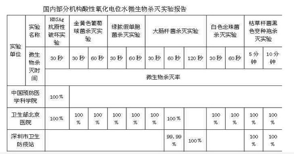 (1)概述:酸性氧化電位水是一種具有高氧化還原電位(ORP),低pH,含低濃度的有效氯的水,它是一種無(wú)色透明的液體,具有氯味,其氧化還原電位(ORP)大于或等于1100mV,pH值在2.7以下,有效氯含量一般為25 mg/L~50mg/L。它具有較強(qiáng)的氧化氯和快速殺滅微生物的作用,對(duì)各種微生物都有較強(qiáng)的殺滅作用。其具有殺菌速度快、安全可靠、不留殘毒、有利于環(huán)保等特點(diǎn)。