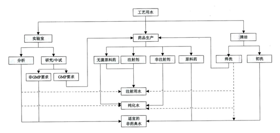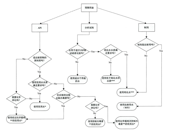 在《美國藥典》制藥用途水中有專門的論述,并有一個圖可供參考USP32 1231 Fig. 2 Selection of water for pharmaceutical purposes.