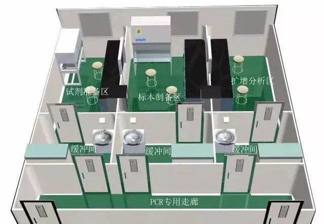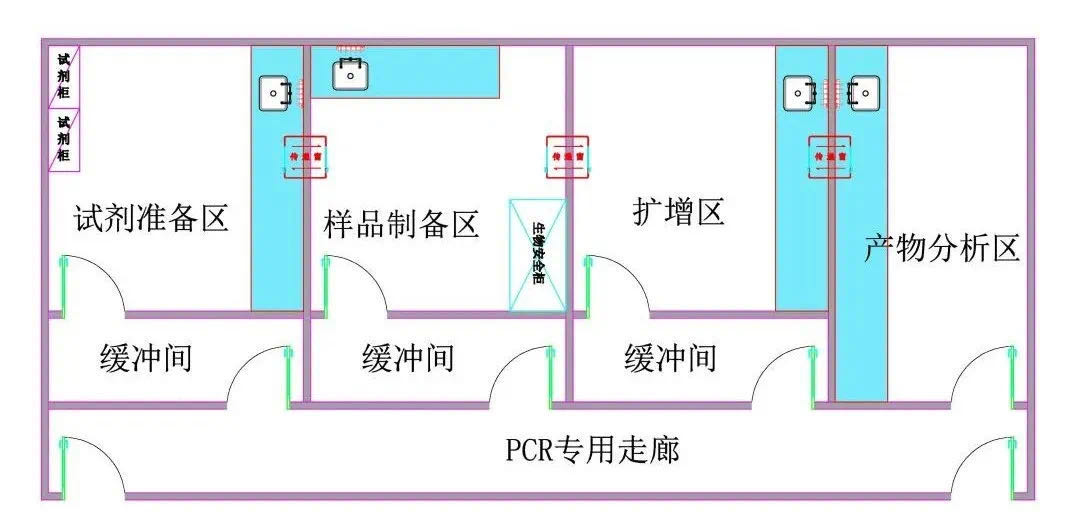 PCR實驗室原則.上分為四個單獨的工作區(qū)域:試劑準(zhǔn)備區(qū)、標(biāo)本制備區(qū)、擴增區(qū)和擴增產(chǎn)物分析區(qū)。為避免交叉污染,進入各個工作區(qū)域必須嚴(yán)格遵循單一方向原則,即只能從試劑準(zhǔn)備區(qū)→標(biāo)本制備區(qū)擴增區(qū)>擴增產(chǎn)物分析區(qū),不得逆向流動,并且各區(qū)完全獨立,如為一個區(qū)套一個區(qū)的模式,區(qū)間不能直通,則必須建有緩沖間,保證兩個區(qū)域間始終處于隔離狀態(tài)。