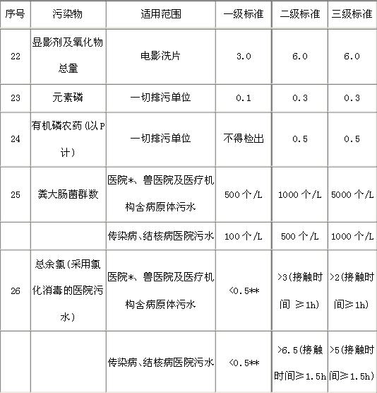 注:* 指50個(gè)床位以上的醫(yī)院。 ** 加氯消毒后須進(jìn)行脫氯處理,達(dá)到本標(biāo)準(zhǔn)。