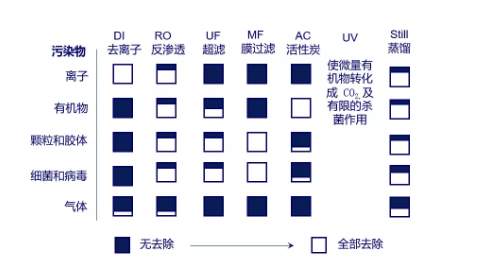 由上表我們可以看出,沒(méi)有一項(xiàng)純化技術(shù)能夠?qū)⒆詠?lái)水中的污染物質(zhì)完全去除,所以想要得到比較純凈的水,需要結(jié)合多種純化技術(shù)來(lái)完成。
