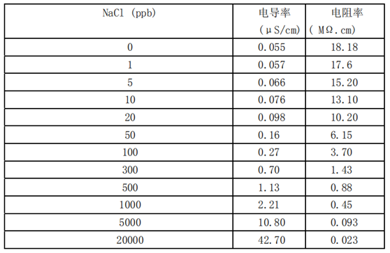 理論上,完全不含離子的超純水在25oC時電導(dǎo)率為0.055μS/cm。